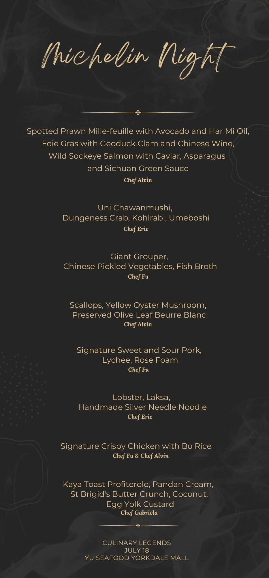 On the evening of July 18, 2024, Yu Seafood in Yorkdale held the event — “Michelin Night” Culinary Legends. This grand event in Canada’s culinary world attracted prominent figures from the city’s dining scene to experience a unique feast that beautifully blended cultural heritage with modern flair.