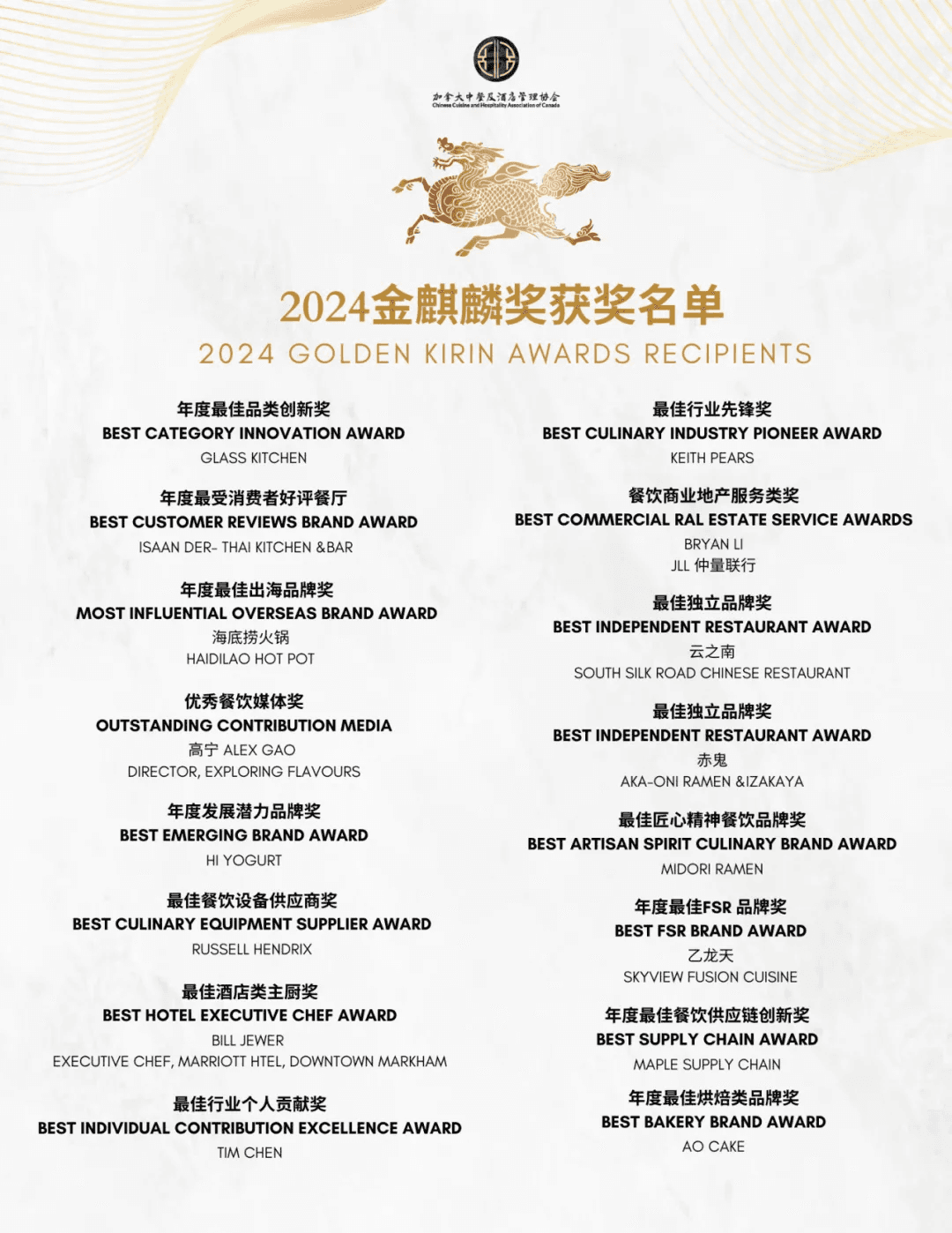 2025 年,奖项类别进一步扩展至 20 大行业殊荣,覆盖餐饮品牌、供应链创新、市场拓展及个人成就等多个领域。该奖项不仅展示了华人餐饮行业的多元化发展和独特竞争力,更是对餐饮人辛勤付出的至高礼赞,标志着华人餐饮业在北美市场迈向更广阔的未来。