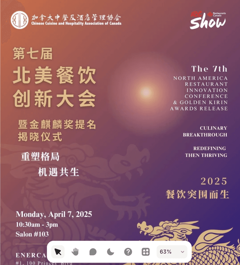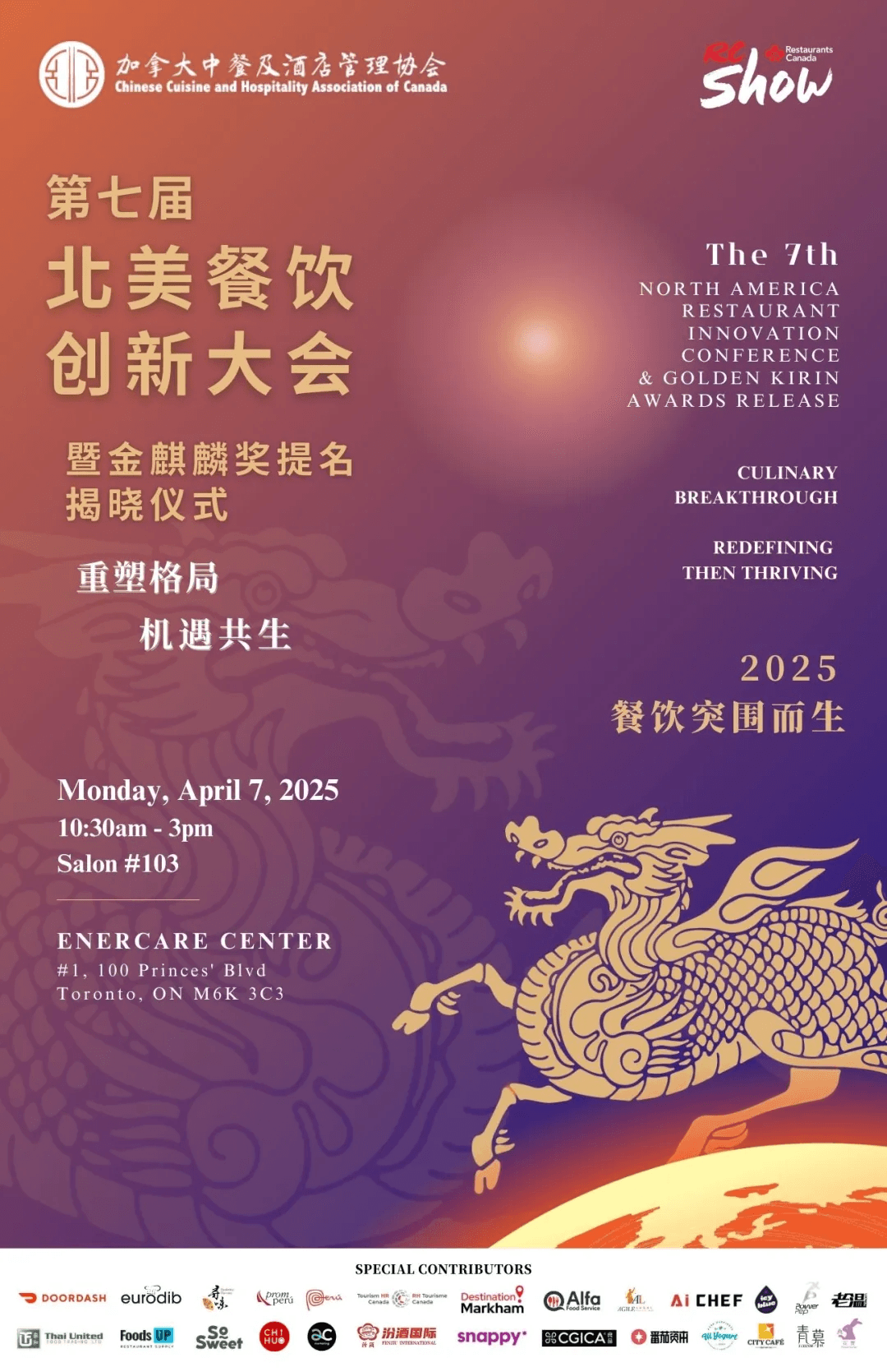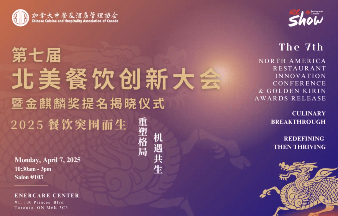 【加拿大中餐及酒店管理协会(Chinese Cuisine & Hospitality Association of Canada)】将在2025年4月7日再次携手【加拿大主流餐饮协会(Restaurants Canada)】,共同见证华人餐饮业在北美市场的精彩绽放。